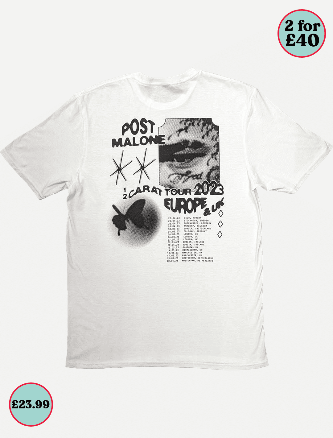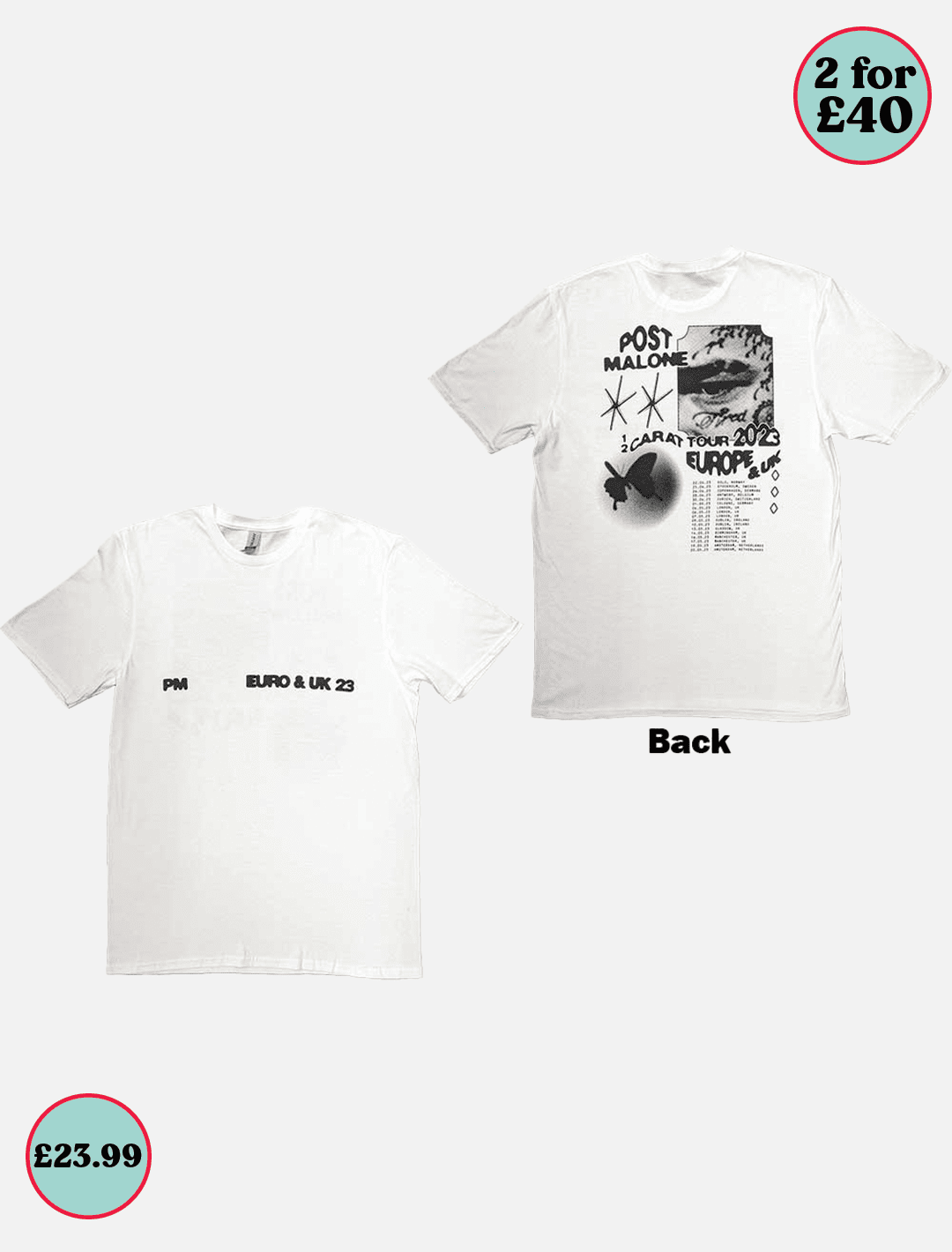 Officially Licensed Post Malone 100% Cotton T-Shirt in White. Deal: Buy two Band / Artist T-Shirts for £40.00. Offer automatically applies to your cart.